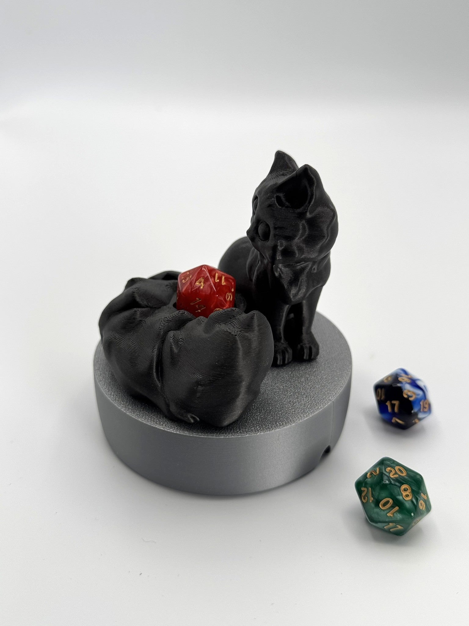 Unleash mystical vibes at your next game night! This handcrafted cat-shaped dice throne, featuring a mesmerizing all-knowing eye, is the purr-fect way for cat lovers and tabletop adventurers to display and protect their dice. 3d printed with environmentally friendly plastic, this unique dice holder combines whimsy and practicality, keeping your favorite polyhedral dice secure while delighting the eyes of everyone at the table.