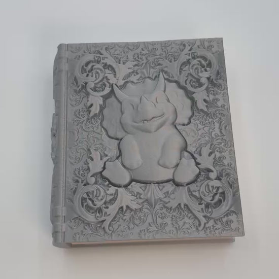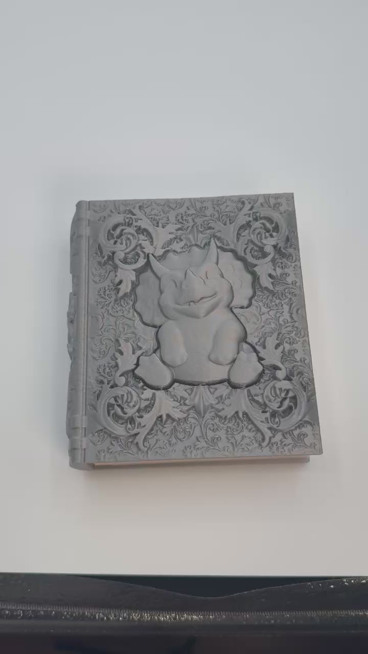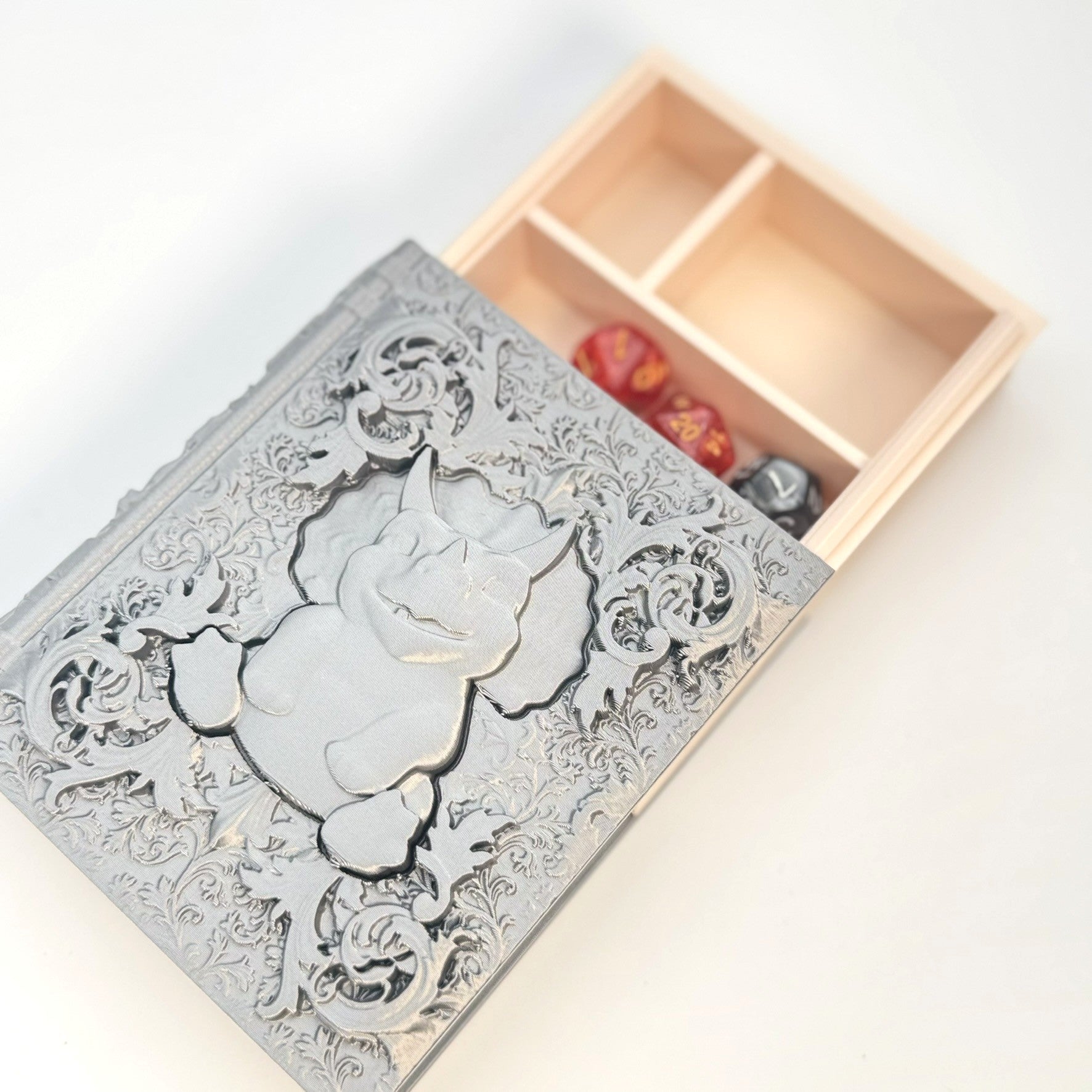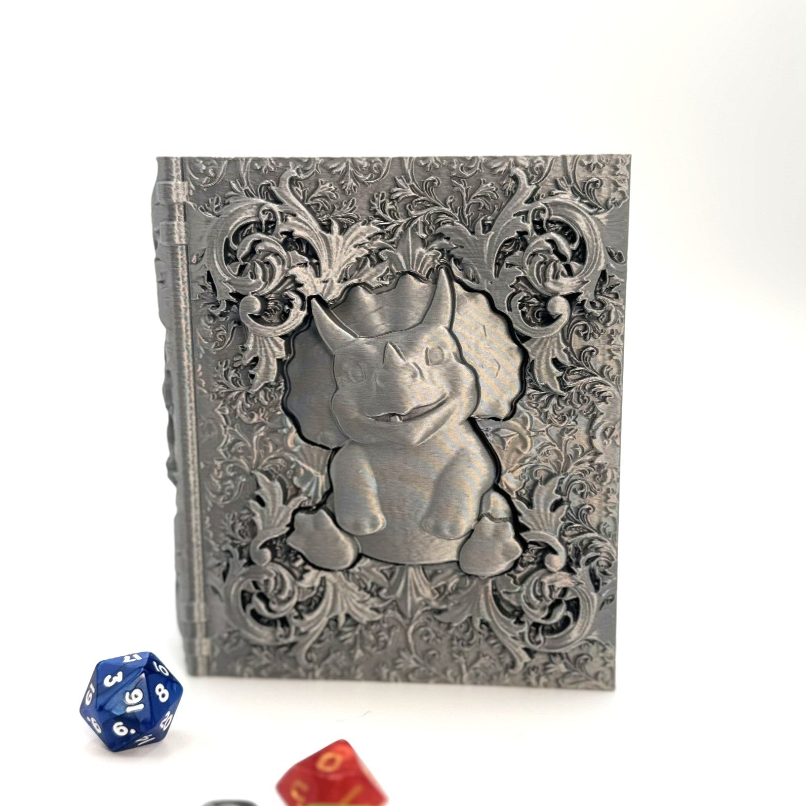 This unique Book Themed Dice Tome brings fun and functionality to your game nights. Designed with a smiling dino on the ornate cover, it’s more than just a dice case—it’s a statement piece for every D&D, Pathfinder, or roleplaying fan. Made from durable silver PLA, this dice tome offers ample space for dice storage and convenient built-in rolling tray. 🦕✨